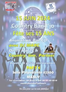 Le Samedi 15 Juin 2024, Journée Country animée par *DJ Marc*, de 15h00 à 23h00, Salle Polyvalente de Mably (42300), Loire.