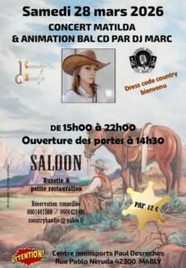 Le Samedi 28 Mars 2026, Journée Country animée par *DJ Marc*, de 15h00 à 22h00, avec Animation Bal cd , Concert de *Matilda*, au Centre Omnisports Paul Desroches, rue