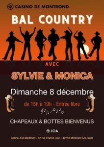 Le Dimanche 08 Décembre 2024, Après Midi Bal Country avec *Sylvie & Monica* , de 15h00 à 19h00, au Casino , 82, rue Francis Laur, à Montrond les