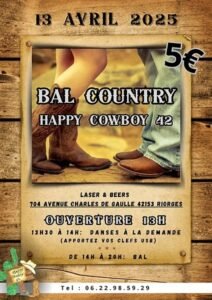 Le Dimanche 13 Avril 2025, Après Midi Bal Country chez *Happy Cowboy*, de 14h00 à 20h00, Laser et Beers, 704 Avenue Charles de Gaulle à Riorges (42153), Loire.