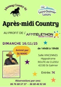 Le Dimanche 16 Novembre 2025, Après Midi Bal Country du Téléthon, animée par *DJ Marc*, de 14h00 à 19h00, Salle Vincennes Hippodrome, Route de Cuzieu, à