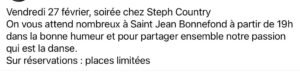 Le Vendredi 27 Février 2026, Soirée Country chez *Steph Country*, à 19h00, à St Jean Bonnefond (42237), Loire.