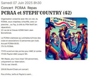 Accueil » Événements » (42) ST JEAN BONNEFONDS / SOIREE COUNTRY CONCERT LE 07.06.25.