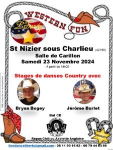 Le Samedi 23 Novembre 2024, Journée Country avec Stages de Danse de *Bryan Bogey* et *Jerome Burlet*, à partir de 14h00, Salle de Carillon, à St N