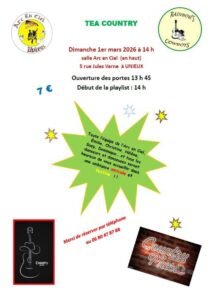 Le Dimanche 1er Mars 2026, Après Midi Bal Country chez *Tea Country*, à 14h00 Salle Arc en Ciel, 5 rue Jules Verne, à Unieux (42240), Loire.