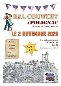 Le Dimanche 02 Novembre 2025, Après Midi Bal Country chez *Country Velay 43*, de 14h00 à 19h00, Salle Communale, à Polignac (43) Haute Loire.
