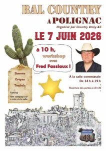Le Dimanche 07 Juin 2026, Journée Country chez *Country Velay 43*, de 10h00 à 19h00, avec Workshop de *Fred Fassiaux* et Bal Country , Salle Communale de Polignac (43