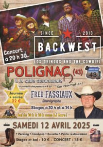 Le Samedi 12 Avril 2025, Journée Country à partir de 09h30, avec Stages de *Fred Fassiaux* et Concert de *Backwest* à 20h30, Salle Communale, à Polignac (43), Hau