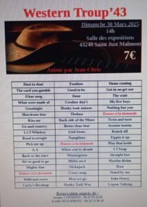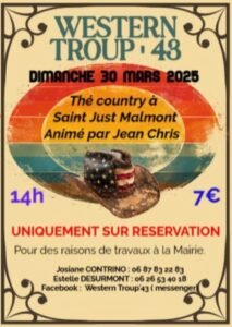 Le Dimanche 30 Mars 2025, Après Midi Thé Country chez *Western Troup ’43*, animée par *Jean Chris*, à 14h00, à St Just Malmont (43240), Haute Loire.