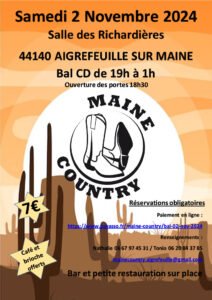 Le Samedi 02 Novembre 2024, Bal Country cd de 19h00 à 01h00, Salle des Richardières, à Aigrefeuille sur Maine (44140), Loire Atlantique.