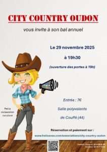Le Samedi 29 Novembre 2025, Bal Country annuel des *City Country Oudon*, à 19h30, Salle Polyvalente de Couffé (44), Loire Atlantique.