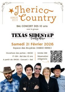 Le Samedi 21 Février 2026, Bal Country avec Concert des *Texas Sidestep*chez *Jherico Country* qui Fetera ses 10 ans, à partir de 17h00, Espace des Bruyèr