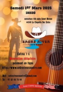Le Samedi 1er Mars 2025, Bal Country des *Erdre River Country*, à 19h30, Salle St Michel, à La Chapelle sur Erdre (44240), Loire Atlantique .