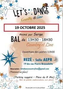 Le Dimanche 19 Octobre 2025, Après Midi Bal Country des *Let’s Dance*, animée par *Serge*, de 13h30 à 18h30, Salle AEPR, 19 bis, rue Pierre Brossolete, à Rezé (44), Loire Atlantique.