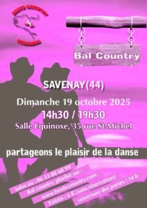 Le Dimanche 19 Octobre 2025, Après Midi Bal Country chez *Boots Country*, de 14h30 à 19h30, Salle Equinoxe, 35 rue St Michel, à Savenay (44), Loire Atlantique.