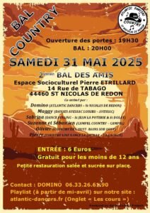 Le Samedi 31 Mai 2025, Bal Country chez *Atlantic Dancers*, à 20h00, Espace Socio Culturel Pierre Etrillard, 14 rue de Tabago, à St Nicolas de Redon (44460), Loire