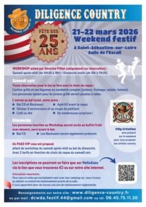 Les 21 et 22 Mars 2026, Week End Festif des *Diligence Country*, qui Feteront leurs 25 ans avec Workshop de *Séverine Fillion*, Concert des *Backwest*, nombreuses Surprises, à L’Escall, à St