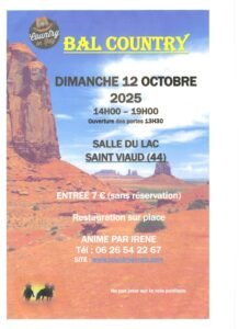 Le Dimanche 12 Octobre 2025, Après Midi Bal Country animée par *Irène*, de 14h00 à 19h00, Salle du Lac, à St Viaud (44), Loire Atlantique.