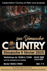 Le Dimanche 09 Février 2025, Journée Country chez *Country en Retz*, à partir de 10h00, avec Workshops de 10h00 à 12h00 et Bal Country de 14h00 à 19h00, Salle du Centre Culturel, rue de la Gare, à St V