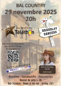 Le Samedi 29 Novembre 2025, Bal Country chez *Arrabloy Dancers*, pour le Téléthon, à 20h00, avec la Présence de *Mathilde*, Salle Polyvalente , Chemin du Bois Cla