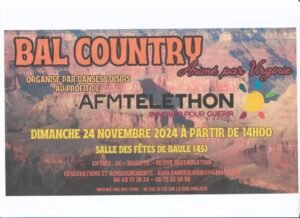 Le Dimanche 24 Novembre 2024, Après Midi Bal Country de * Danses Loisirs*, animé par *Virginie*, au profit du Téléthon, à 14h00, Salle des Fetes de Baule (45), Loiret .