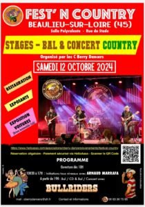 Le Samedi 12 Octobre 2024, Journée Fest’N Country, avec Stages et Bal Country Concert de Bullriders*, Salle Polyvalente, rue du Stade, à Beaulieu sur Loire (45), Loiret.