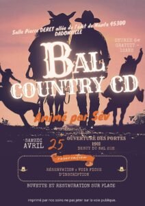 Le Samedi 25 Avril 2026, Bal Country cd animé par *Sèv*, à 20h00, Salle Piere Deret, Allée de L’édit de Nante, à Dadonville (45300), Loiret.