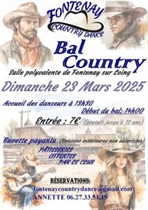 Le Dimanche 23 Mars 2025, Après Midi Bal Country à 14h00, chez *Fontenay Country Dance*, Salle Polyvalente de Fontenay sur Loing (45210), Loiret.
