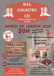 Le Samedi 25 Janvier 2025, Bal Country cd animé par *Val Le Maitre & Mathilde*, à 20h00, Salle des Fetes du Gidéum, rue du Stade, à Gidy (45520), Loiret.