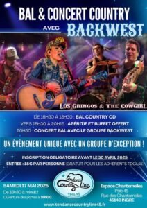 Le Samedi 17 Mai 2025, Soirée Country chez *Tendance Country Line*, de 16h30 à 00h00, avec Bal Country cd, Apéro et Concert des *Backwest*, Espace Chantemelles, rue des Chantemelles, à Ingré (45140), Loiret.