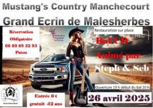 Le Samedi 26 Avril 2025, Bal Country cd des *Mustang’s Country Manchecourt*, animé par *Steph et Seb*, à 20h00, Grand Ecrin de Malesherbes (45330), Loiret.