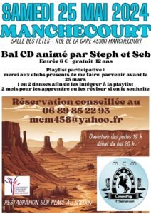 Le Samedi 25 Mai 2024, Bal Country cd animé par *Steph et Seb*, à 20h00, Salle des Fetes, rue de la Gare, à Manchecourt (45300), Loiret.