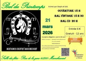 Le Samedi 21 Mars 2026, Bal du Printemps cd des *Mustangs Country Manchecourt*, à 20h00, Salle des Fêtes, rue de la Gare, à Manchecourt (45300), Loiret.