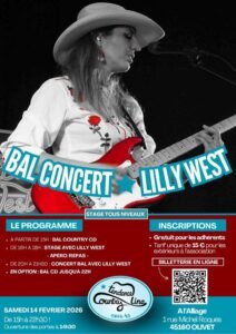 Le Samedi 14 Février 2026, Journée Country chez *Tendance Country Line*, à partir de 15h00, avec Bal Country cd, Stage de *Lilly West*, Apéro Repas, Bal Concert de *Lilly West, et Bal cd , à L’Alliage, 1 rue Michel Roques, à Olivet (45160), Loire