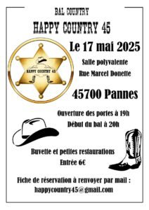 Le Samedi 17 Mai 2025, Bal Country chez *Happy Country 45*, à 20h00, Salle Polyvalente , rue Marcel Donette, à Pannes (45700), Loiret.