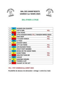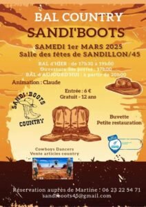 Le Samedi 1er Mars 2025, Bal Country des *Sandi’Boots*, animé par *Claude*, avec Bal D’hier de 17h30 à 19h00 et Bal D’aujourd’hui à 20h00, Sa