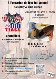 Le Samedi 26 Avril 2025, Bal Annuel Country et Line Dance avec Concert de *Bruno le Grizzly*,à 20h00 chez *Les 100Tiags*, Salle Polyvalente de St Martin D’Abbat (45), Loiret.