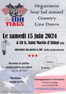 Le Samedi 15 Juin 2024, Bal Country Line Dance des *100 Tiags*, à 20h00, Salle Polyvalente de St Martin D’Abbat (45), Loiret.