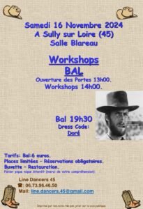 Le Samedi 16 Novembre 2024, Journée Line Dance à partir de 14h00, avec Workshops et Bal à 19h30, Salle Blareau, à Sully sur Loire (45), Loiret.