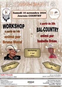 Le Samedi 16 Novembre 2024, Journée Country à partir de 14h00, avec Woekshop de *Bruno Morel* et Bal Country animépar *Isabelle Dréau* à 20h00, Salle L’Escale, 43, rue du