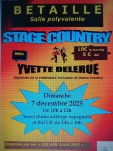Le Dimanche 07 Décembre 2025, Journée Country des *Silver Dancers*, de 10h00 à 18h00, avec Stage Country de *Yvette Delerue*, suivi d’une Auberge Espagnole et d’un Bal cd à 14h00, Salle Polyvalente de Betaille (4