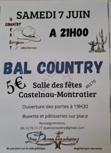 Le Samedi 07 Juin 2025, Bal Country chez *Quercy Country*, à 21h00, Salle des Fetes de Castena Montratier (46170), Lot.