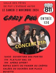 Le Samedi 02 Novembre 2024, Soirée Country à partir de 16H30, avec Playlist Bal Cd , Apéro offert, Repas et Concert des *Crazy Pug* à 21h00, Salle des Fetes de Puy L’évèque (4670
