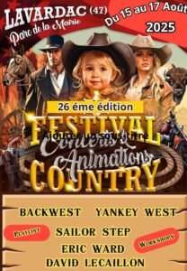 Du 15 au 17 Aout 2025, 26 ème Festival Country avec *Backwest *, *Yankey West*, *Sailor Step*, *Eric Ward* et *David Lecaillon*, au Parc de la Mairie de Lavardac (47), L