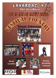 Du 13 au 16 Aout 2026, aura lieu le Festival Country Concerts, Workshops, au Parc de la Mairie de Lavardac (47), Lot et Garonne.