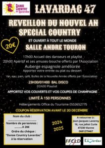 Le Mardi 31 Décembre 2024, Soirée Réveillon Spécial Country, à partir de 20h00, Salle André Touron, à Lavardac (47), Lot et Garonne.