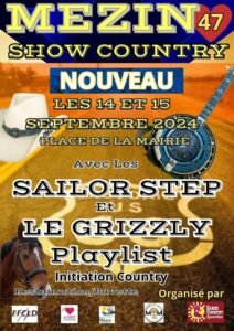 Les 14 et 15 Septembre 2024, Week End Show Country , avec Initiation Country et Concerts des *Sailor Step* et *Bruno le Grizzly*, Place de la Mairie, à Mezin (47), Lot et Garonne.