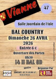 Le Dimanche 26 Avril 2026, Après Midi Bal Country cd , des *Danse Country Lavardac*, à 14h00, Salle Jourdain de L’Isle, à Vianne (47), Lot et Garonne.