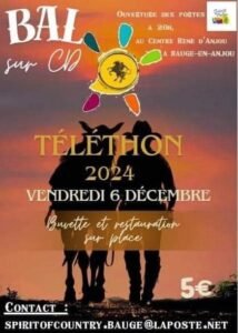 Le Vendredi 06 Décembre 2024, Bal Country cd des *Spirit Of Country*,au profit du Téléthon, à 20h00, au Centre René D’Anjou, à Bauge en Anjou (49), Maine et Loire.