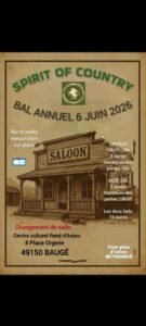 Le Samedi 06 Juin 2026, Journée Country annuel des *Spirit Of Country*, à partir de 15h30, avec Bal Vintage et Bal le Soir, au Centre Culturel René D’anjou, 4 Place Orgerie, à Baugé (49150),